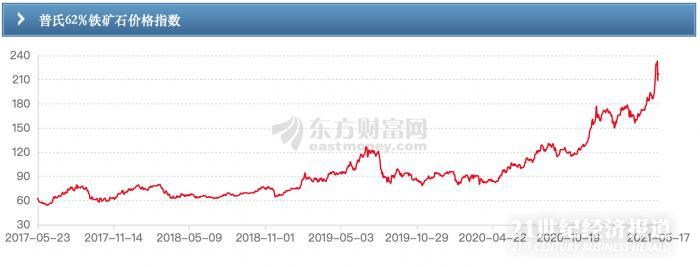 近期,铁矿石价格不断创出新高,像普氏62%铁矿石价格5月12日飙升至233.1美元/吨的水平,近期该价格有所回调。与此同时,随着国内国际需求的复苏,以及国内碳中和碳达峰的推进,压减粗钢产能等工作,一定程度上也加剧了钢铁供需矛盾。