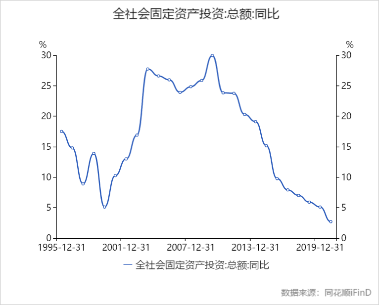 虽然资源股是当下A股市场最大风口之一,但其真正的高光时刻,是在2000-2012年。彼时正是中国经济发展最迅速的时期,GDP年均增速超过10%,快速城镇化和旺盛的外需市场,带动了我国的基础设施和制造业发展的狂潮,全社会固定资产投资年均增速超过20%,成为推动经济增长的最强动力。