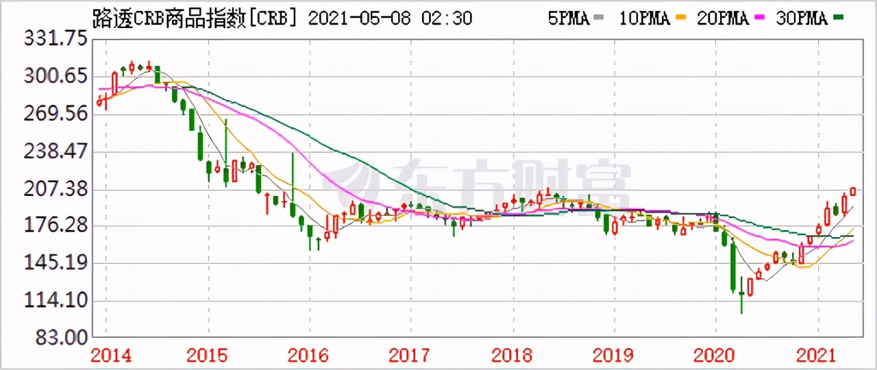 汤森路透社核心商品CRB指数(国际著名大宗商品指数)5月8日涨至206.96点,创出2018年10月3日以来新高,与2020年4月的低点相比,涨幅高达90%。
