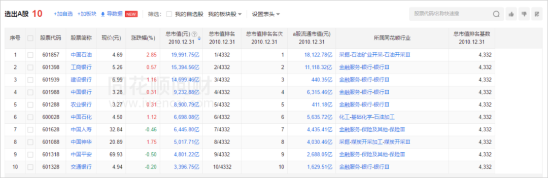 ▲2010年A股市值前10大公司 来源:同花顺iFinD
