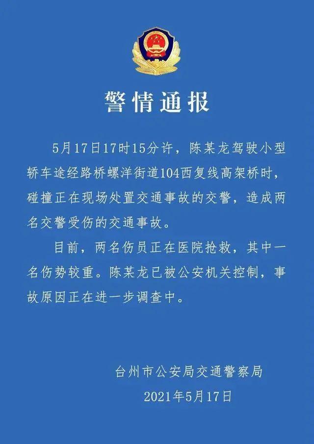 台州市公安局交通警察局发布通报称:5月17日17时15分许,陈某龙驾驶小型轿车途经路桥螺洋街道104西复线高架桥时,碰撞正在现场处置交通事故的交警,造成两名交警受伤的交通事故。目前,两名伤员正在医院抢救,其中一名伤势较重。陈某龙已被公安机关控制,事故原因正在进一步调查中。