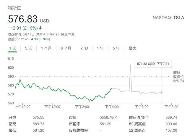 特斯拉股价周一一度下跌5%。截至收盘,跌幅略有收窄,特斯拉股价收跌2.19%,报576.83美元。该公司股价在2020年飙升了740%之后,在2021年已下跌接近20%。