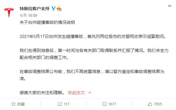 5月18日上午,特斯拉客户支持微博发声明回应台州碰撞事故。