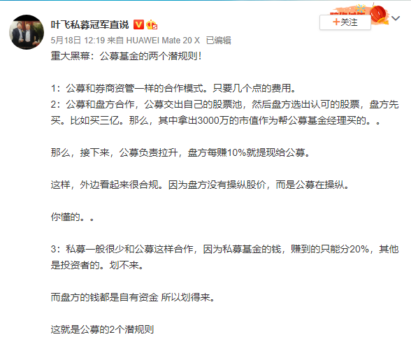 虽然关键接盘方的信息不肯爆料,但叶飞在5月18日中午爆料公募基金存在两个潜规则: