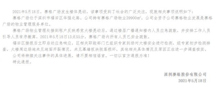 消息面上,5月18日“深圳华强北的79层地标大厦”深圳赛格大厦出现晃动,现场有人员从大厦撤离。“赛格广场大楼晃动”相关话题登上微博热搜,引发网友广泛关注。