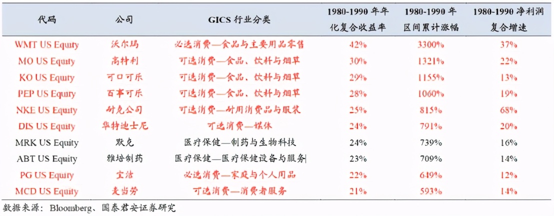 80-90年代美国消费升级的黄金时代,大市值公司收益率前十的公司中有8个消费股,2个为医药股。