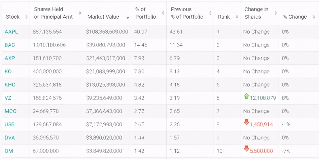 股神巴菲特旗下的伯克希尔公布了最新持仓,本季度伯克希尔持仓中,前十大重仓股变动较少,前五大重仓股更是不增不减。其中,苹果、美国银行、美国运通、可口可乐、卡夫亨氏位列前5大重仓股,苹果公司更是以40%持仓占比雄居第一大重仓股,受苹果持仓占比高的影响,伯克希尔公司前十大持仓占比达86%。