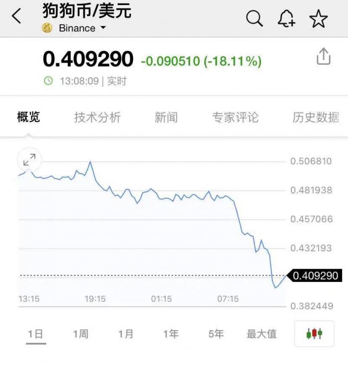 同日,近期被马斯克大力喊单的“狗狗币”价格也大幅跳水,失守0.4美元/枚,日内跌幅扩大至20%。