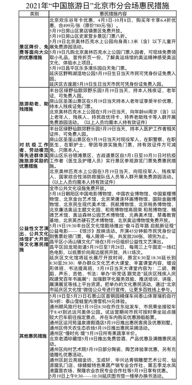 同时,北京市还将推出多条惠民举措,主要包括部分景区面向市民降价或免费。例如北京欢乐谷年卡购卡优惠,原价780元/张优惠至499元/张;5月19日当天房山区窦店镇景区免费开放、史家营乡景区门票八折;5月19日当天,北京奥林匹克水上公园向身高1.3米(含)以下儿童开展免费游园活动等;延庆区野鸭湖湿地公园5月19日生日当天市民可凭身份证免费入园;延庆区古崖居5月19日生日当天市民可凭身份证免费入园等。