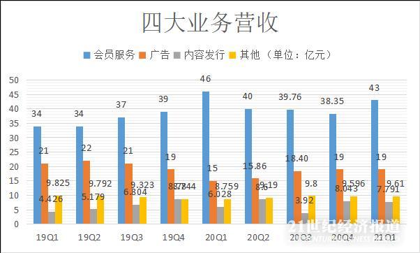2021年第一季度,爱奇艺会员服务收入为43亿元,较2020年同期的46亿元同比下滑7%,但环比增长12%,创四季度以来新高;一季度爱奇艺广告实现19亿元营收,得益于宏观经济的复苏,品牌广告预算和品牌广告主的数量都出现了反弹,广告收入同比增长25%;内容发行实现收入 7.791亿元,同比增长29%;以IP为核心的其他营收第一季度营收9.610亿元,相比去年同期增长了10%。