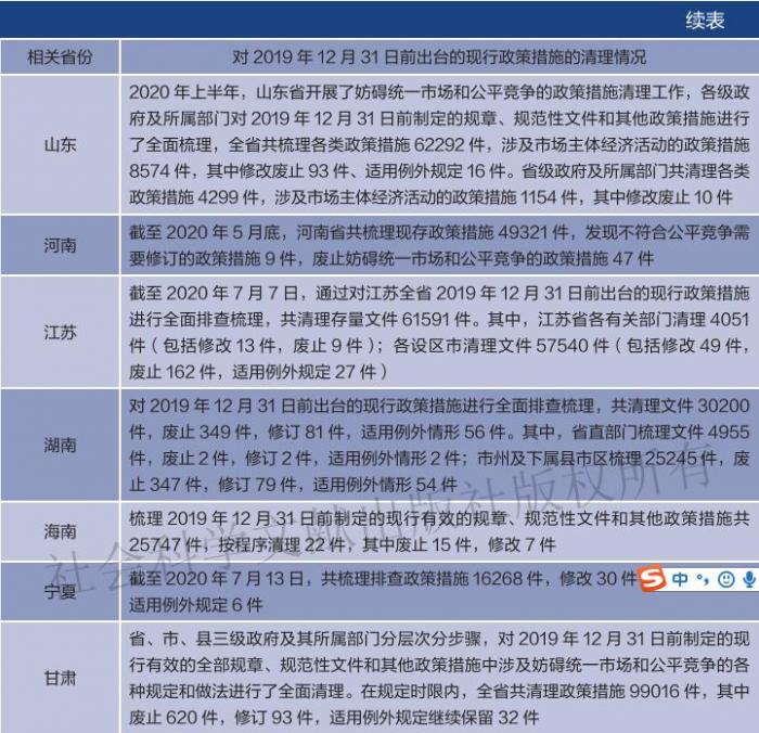 再比如,2020年以来,山东省共梳理各类政策措施62292件,发现存在妨碍统一市场和公平竞争问题的政策措施109件,涉及修改19件,废止74件以及适用例外规定16件。