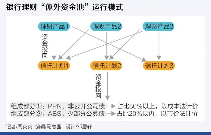 21世纪经济报道记者多方了解到,在资管新规严令禁止银行资管滚动发行的资金池模式之后,行业内又出现了一种“擦边球”的新招——通过信托通道设立“体外资产池”,大量装入PPN(非公开定向债务融资工具)、非公开公司债等可以采用买入成本法计价的资产,同一家银行的不同理财产品的申购赎回,均可通过同一个资产庞大的信托计划来调节收益,使净值趋于稳定。