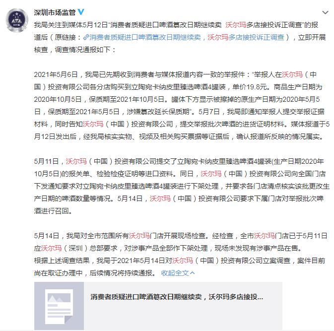 此前5月19日,深圳市场监管发布消息称,已关注到媒体5月12日“消费者质疑进口啤酒篡改日期继续卖沃尔玛多店接投诉正调查”的报道后,立即开展核查,调查情况通报: