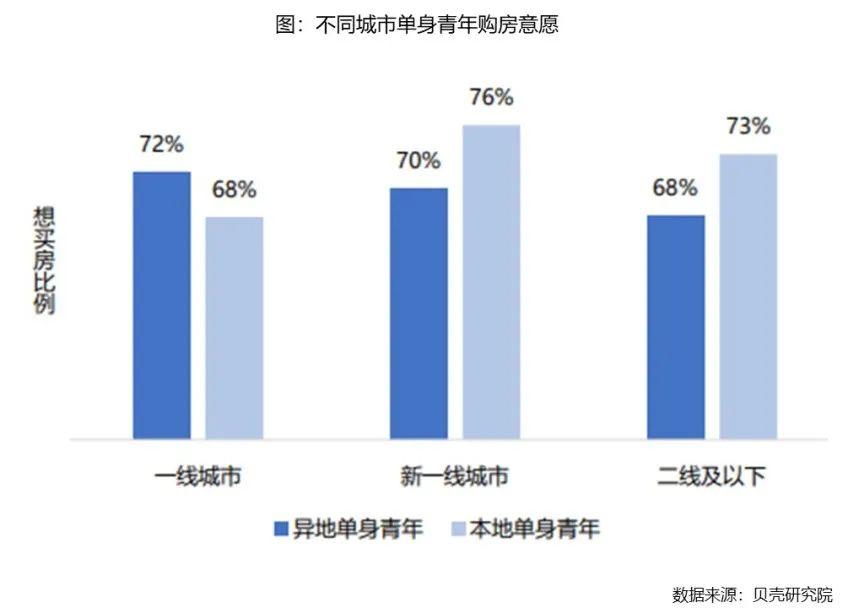 异地漂泊的大城市单身青年对“家”的慰藉更为渴求。根据调研,近六成一线城市单身青年和近半数新一线城市单身青年来自异乡,他们中想要买房的占比超过70%,高于二线及以下城市。而本地青年的购房意愿受到现实因素和实用价值等多方面影响,新一线城市的本地单身青年置业愿望最高,占比达到76%。