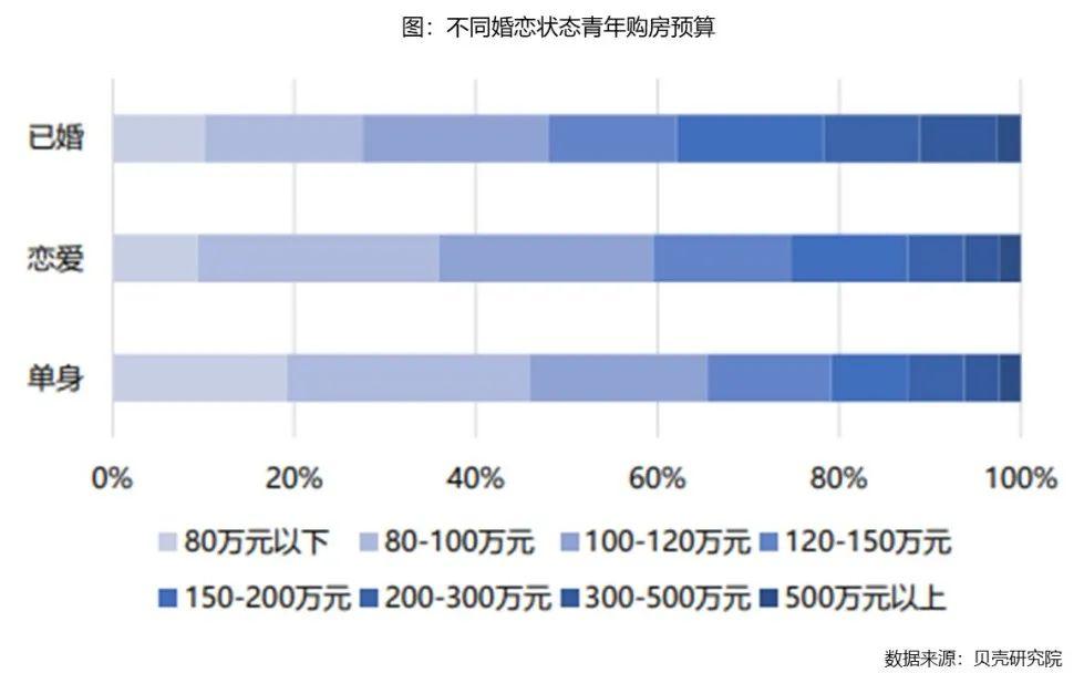 支撑青年购房梦的,是“多个荷包”。《报告》指出,73.19%的单身青年受访者购房资金中有自有存款,60.86%有家人支持,高于恋爱或已婚状态的青年群体。与已婚青年相比,单身青年的购房实力稍逊,购房预算在百万元以上的单身、婚恋、已婚占比分别为54.01%、64.14%和72.50%。