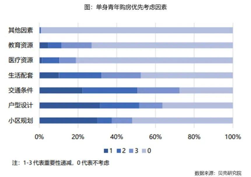 值得关注的是,单身青年偏爱新房、小户型。调研显示,仅14.68%的单身青年倾向二手房,占比明显低于恋爱或已婚状态的21.6%和20.19%。购房理想面积80平方米以下的单身青年占比28.96%,超过已婚青年群体占比。此外,单身青年较为看重房屋周边交通条件,户型设计、生活配套及小区规划,相对而言,教育、医疗资源对购房意愿影响较小。