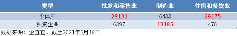 结合行业来看,企查查数据显示,批发零售业、住宿餐饮业中个体户的占比较高,尤其是住宿餐饮业,高达98%;而制造业中独资企业的占比较高,达到58.9%,如果加上个体户,制造业个体经济的占比高达87.83%,说明批发零售业、住宿餐饮业中成熟度较低,而制造业发展相对成熟。