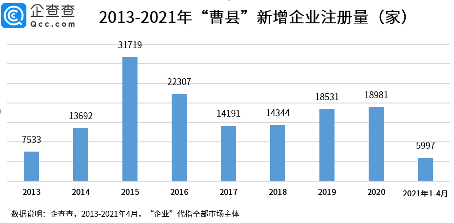 企查查数据显示,截至当前,曹县在业/存续的企业共有11.59万家。从年新增趋势来看, 2015年、2016年是曹县企业注册的爆发期,分别新增3.17万家、2.23万家;2017年和2018年下降至1.4万家左右,2019年、2020年回升到1.8万家以上。