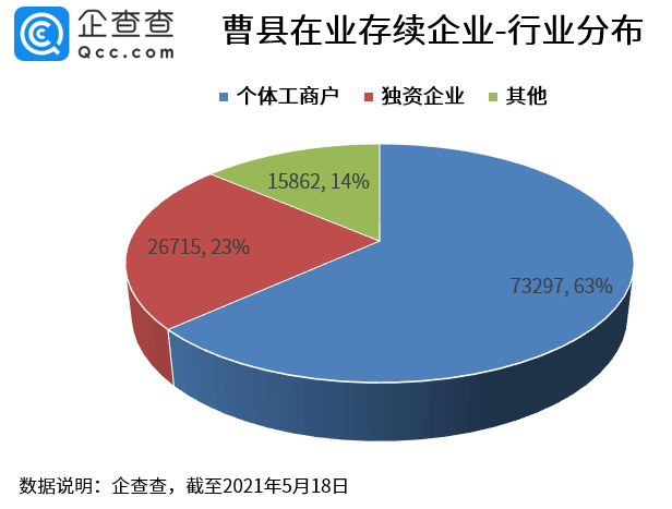 企查查数据显示,批发和零售业、住宿和餐饮业以及制造业是曹县企业数量最多的三个行业,分别有3.83万家、2.98万家和2.24万家。这三大行业占整体的比重高达78.07%,可以说是曹县经济发展的支柱性产业了。