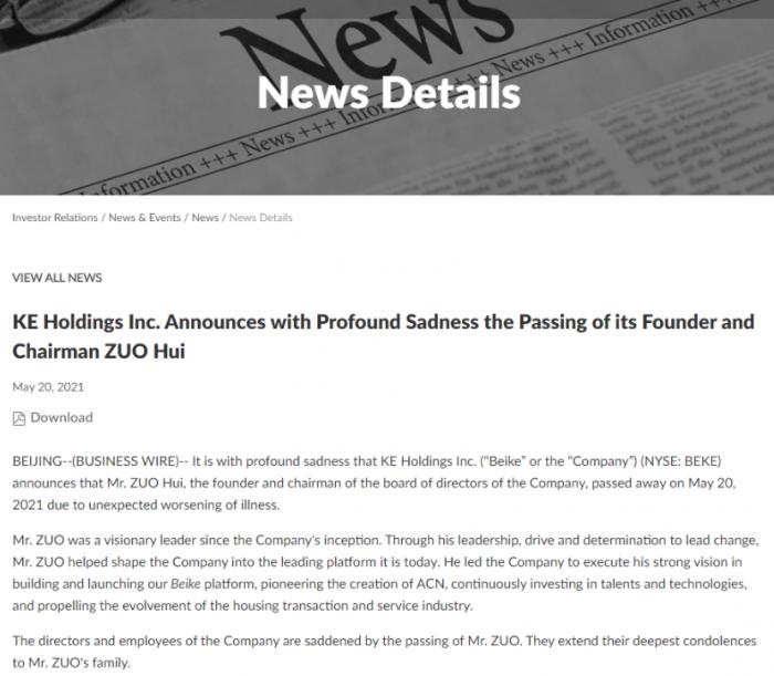 据贝壳找房订阅号消息,贝壳公司创始人兼董事长左晖先生因疾病意外恶化于2021年5月20日去世。公司董事会将对公司治理和相关事宜作出适当安排,并在两周内适时公布。