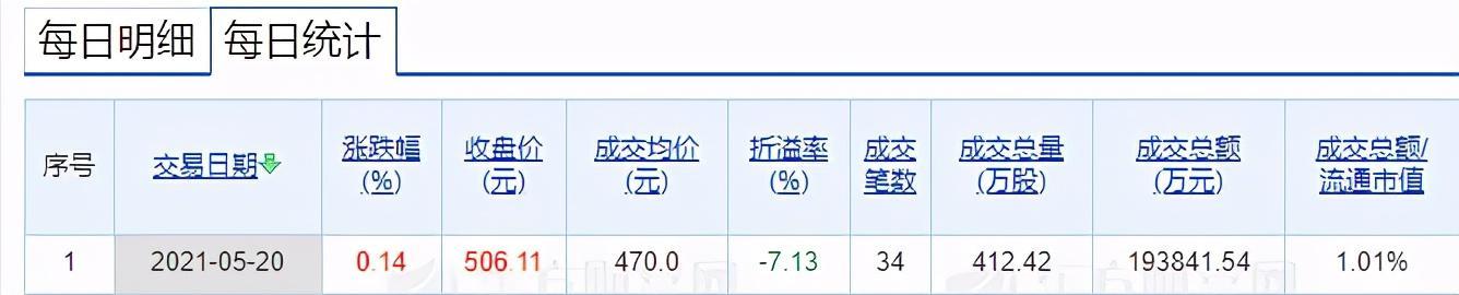 5月20日数据显示,长春高新出现了34笔大宗交易,成交均价是470元,折价7%,成交总金额19.38亿元。卖方是中天国富证券吉林分公司,买方多为机构席位。