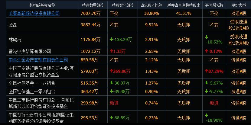 今年4月20日,长春高新解禁数量为1996.69万股,其中,第二大股东金磊解禁数量为1555.57万股,第三大股东林殿海解禁数量为441.4万股。