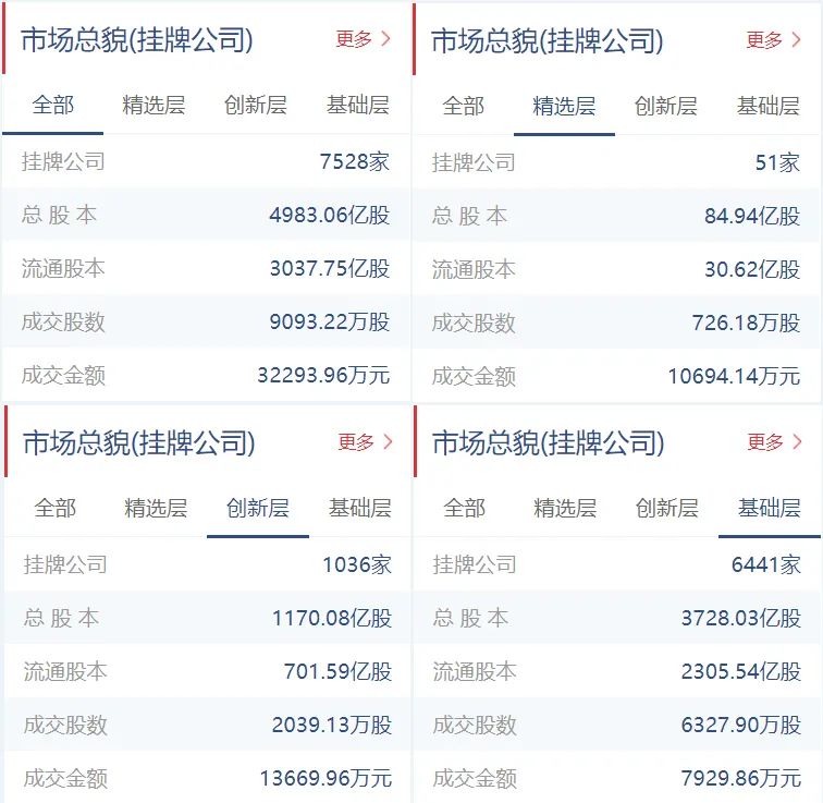 新三板挂牌公司总计7528家(精选层51家,创新层1036家,基础层6441家),总股本4983.06亿股,流通股本3037.75亿股。