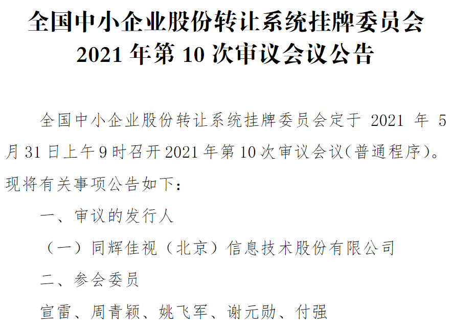 5月21日,全国股转网站显示,挂牌委员会定于5月31日上午9时召开2021年第10次审议会议,审议同辉信息(430090)的精选层挂牌申请。
