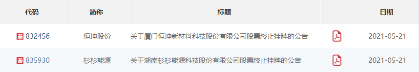 5月21日,全国股转网站显示,新三板基础层公司恒坤股份、杉杉能源终止挂牌。