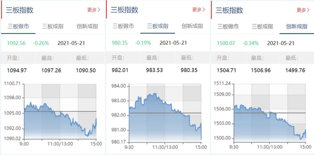 截至5月21日收盘,三板做市报1092.56点,下跌0.26%;三板成指报980.35点,下跌0.19%;三板创新报1500.87点,下跌0.34%。