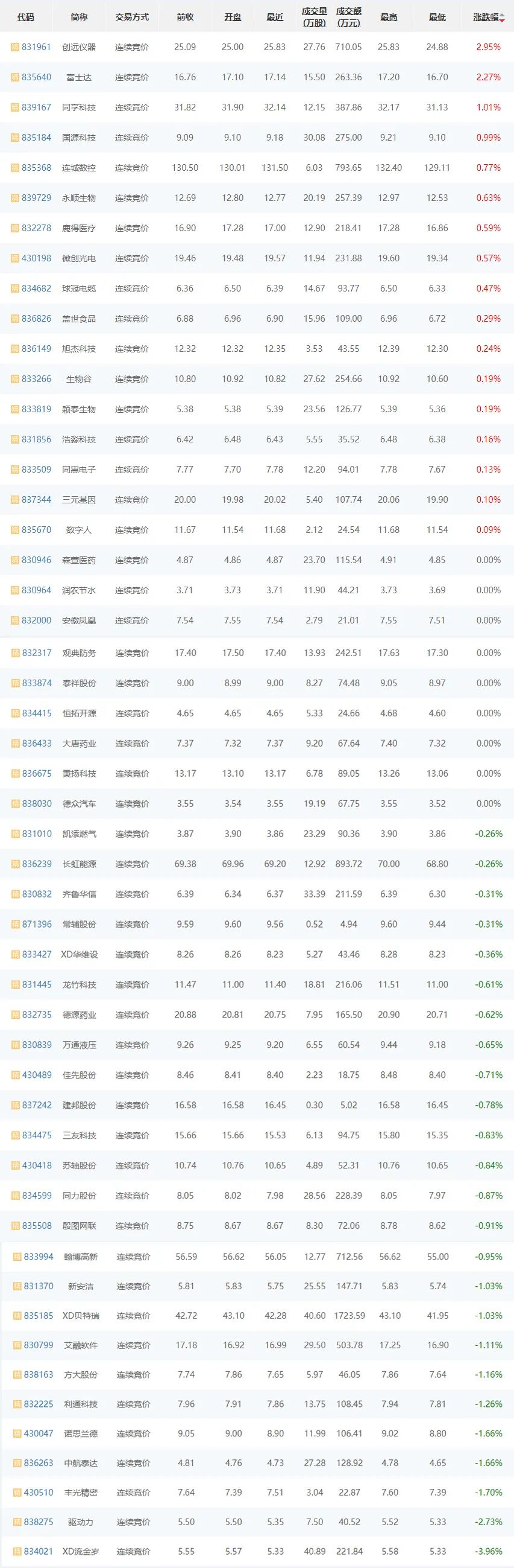 5月21日,精选层普跌,16家企业上涨,9家平盘,26家下跌。其中,创远仪器(831961)涨幅居首,上涨2.95%;其次,富士达(835640)上涨2.27%;流金岁月(834021)下跌3.96%,跌幅居首;驱动力(838275)下跌2.73%居次;森萱医疗(830946)、润农节水(830964)等平盘。