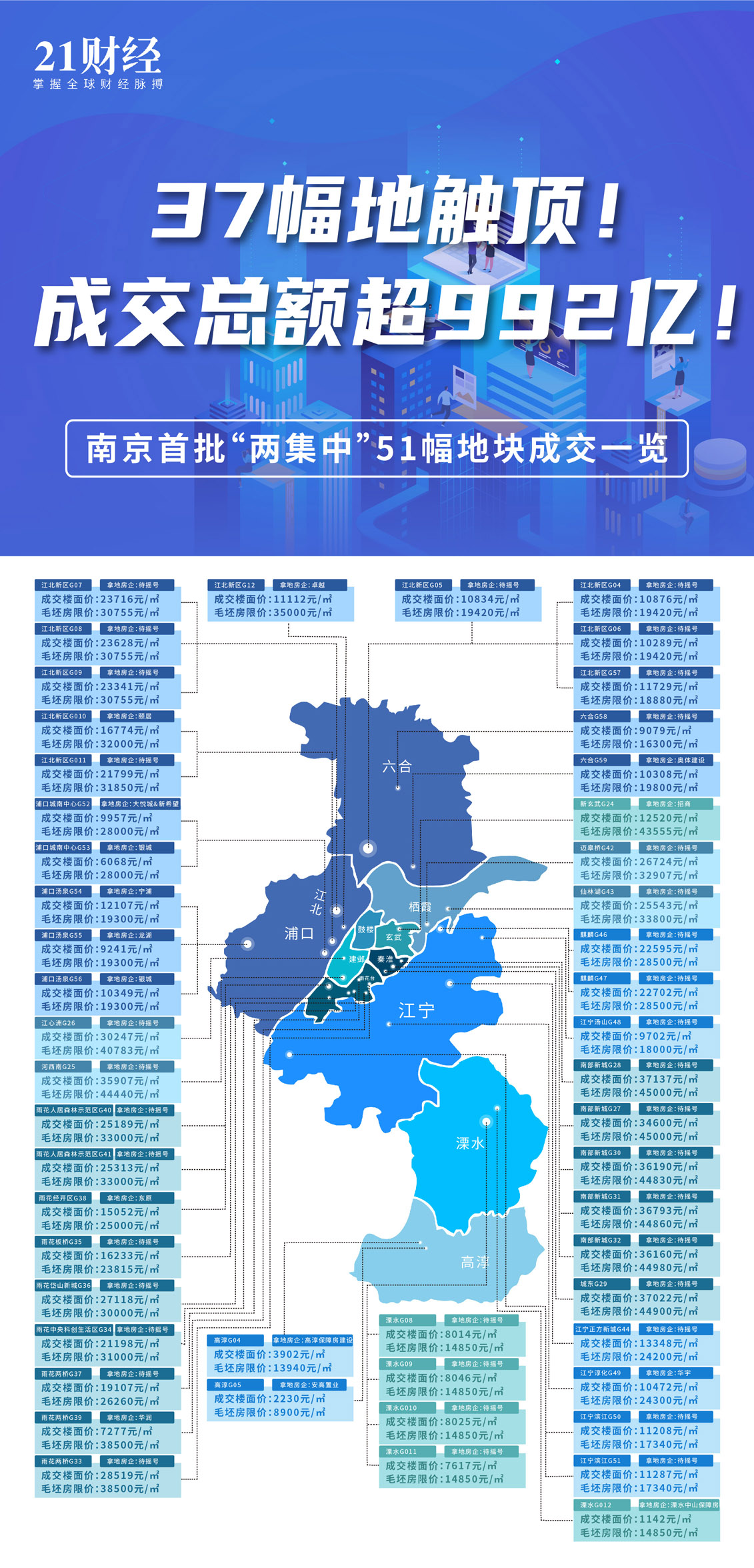 5月20-21日,南京进行了首批两集中地块的出让,两天内51幅涉宅地块全部成功出让,其中37幅触顶最高限价,36幅待摇号,成交总金额超992亿,明天下午现场摇号确定最终竞得者。