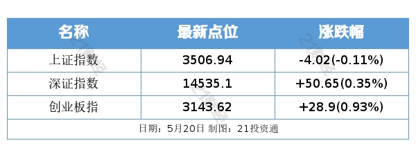 5月20日,沪指跌0.13%,深成指涨0.35%,创业板指涨0.93%。板块上,白酒、证券板块全线飘红,碳中和板块午后走弱,钢铁、煤炭等周期股大跌,医美板块冲高回落。