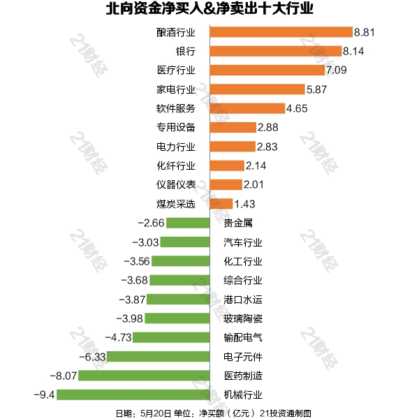 从净买入金额来看,北向资金增持了29个行业,其中酿酒行业居首,净买入金额达8.81亿元,其次是银行行业,净买入8.14亿元。