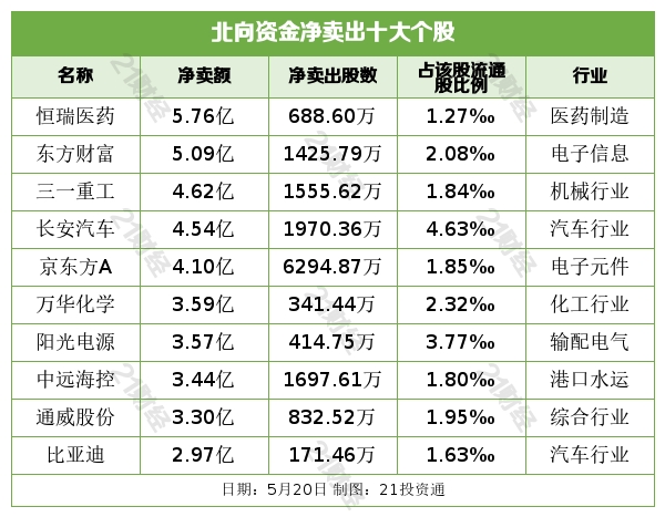 北向资金净卖出恒瑞医药(600276.SH)、东方财富(300059.SZ)、三一重工(600031.SH)、长安汽车(000625.SZ)、京东方A(000725.SZ)居前。