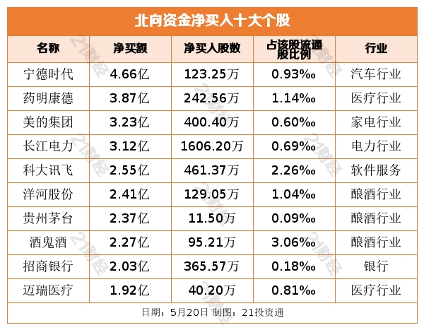 个股方面,北向资金净买入宁德时代(300750.SZ)、药明康德(603259.SH)、美的集团(000333.SZ)、长江电力(600900.SH)、科大讯飞(002230.SZ)居前。