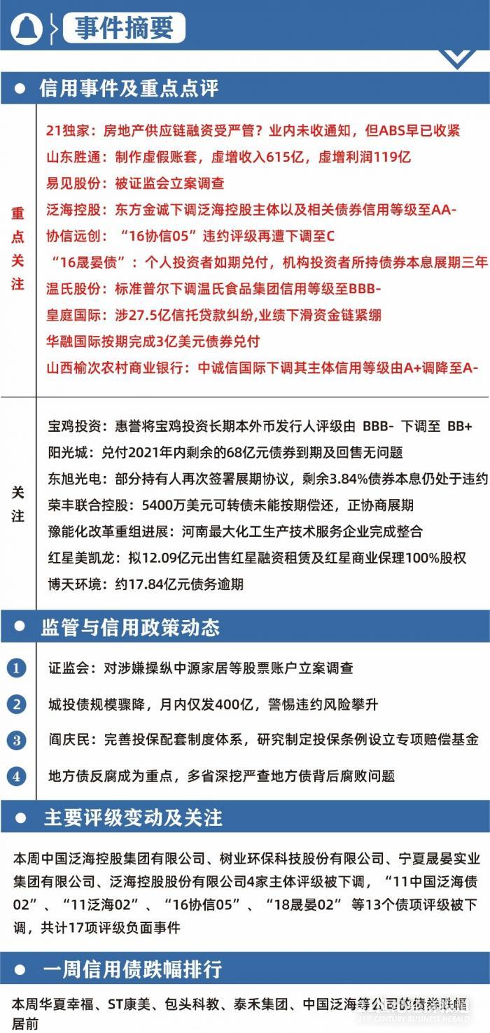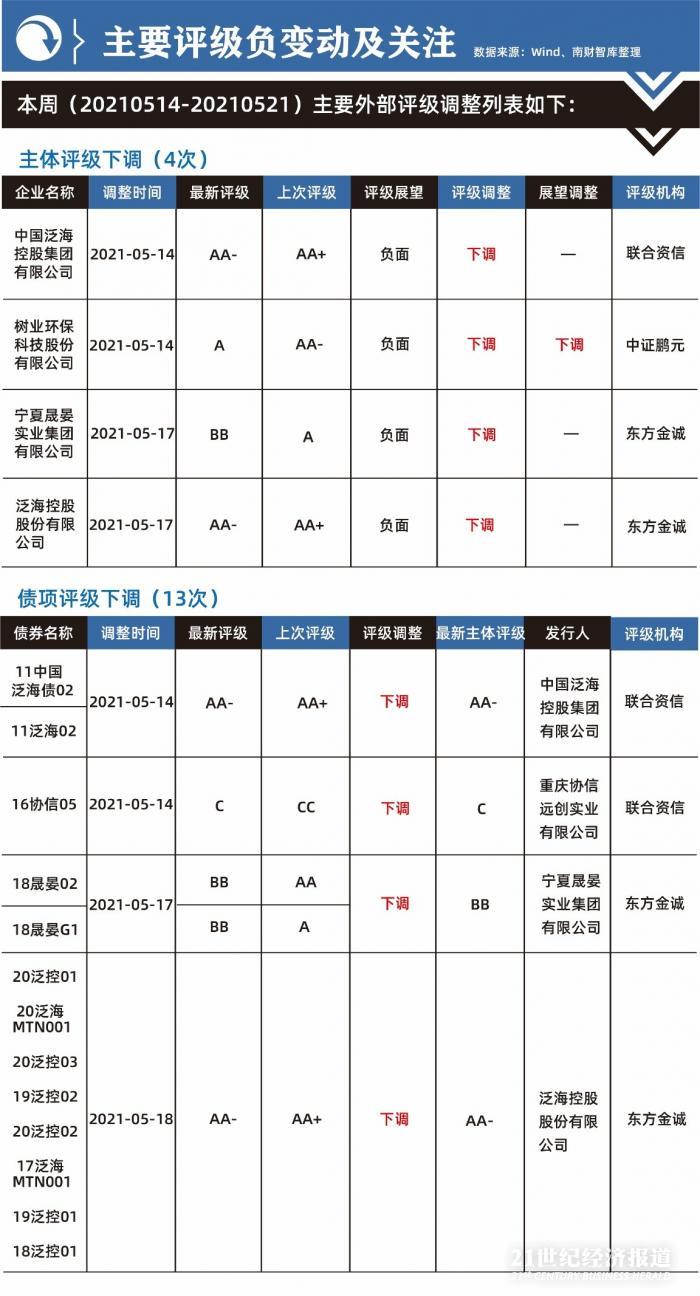 5月18日,东方金诚决定,将泛海控股主体信用等级由AA+下调至AA-,评级展望调整为负面,“17泛海MTN001”、“18泛海MTN001”债项信用等级由AA+下调至AA-,并移出评级观察名单。公告显示:泛海控股2020年业绩亏损、控股子公司近期涉诉及被执行记录持续增多、控股股东中国泛海所持公司部分股份被冻结和司法拍卖。另,2021年5-12月,泛海控股到期及回售境内债券本金余额为42.5亿元、境外美元债4.902亿美元,债券集中兑付压力较大。