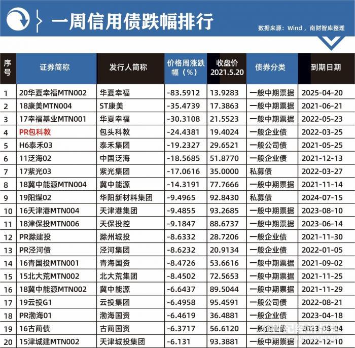 本周交易日(20210517-20210520)信用债(包括企业债、公司债、中期票据、短期融资券)价格跌幅(排除偿还本金、派息等因素导致的价格下跌)前20只债券,跌幅范围为-83.59%~至-6.13%。