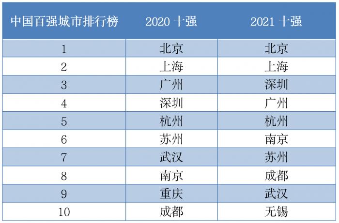 2021 年十强城市为北京、上海、深圳、广州、杭州、南京、苏州、成都、武汉、无锡。对比2020年,十强位次已变。