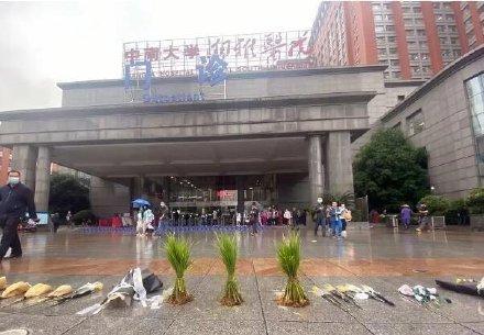 长沙的湘雅医院门外,人们摆满鲜花,还有人拿来3捆带着泥土的水稻,以此缅怀。