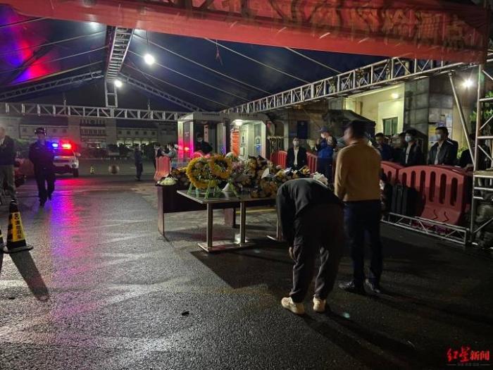 明阳山殡仪馆外,献花的群众鞠躬致敬。