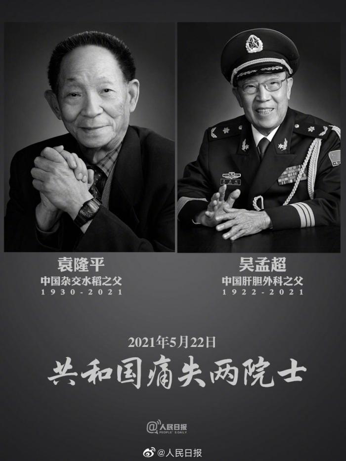 5月22日13时02分,“中国肝胆外科之父”吴孟超逝世,享年99岁。5月22日13时07分,“杂交水稻之父”袁隆平逝世,享年91岁。国士无双,愿世间如你们所愿医食无忧,送别!