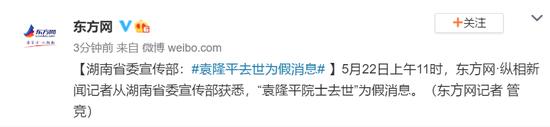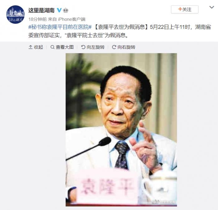 随后,湖南省人民政府新闻办公室发布微博表示,5月22日上午11时,湖南省委宣传部证实,“袁隆平院士去世”为假消息。