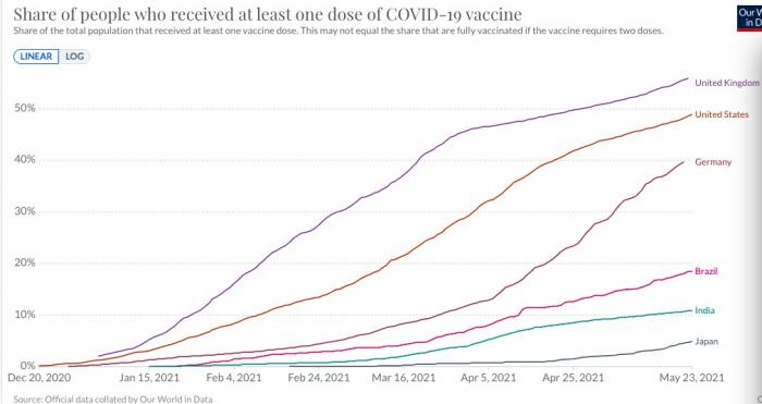 根据英国牛津大学旗下数据网站OurWorldinData的数据,截至5月23日,日本至少接种了一剂新冠疫苗的人数仅为613万人,约占日本人口的4.8%,这一接种比例在发达国家中明显落后。