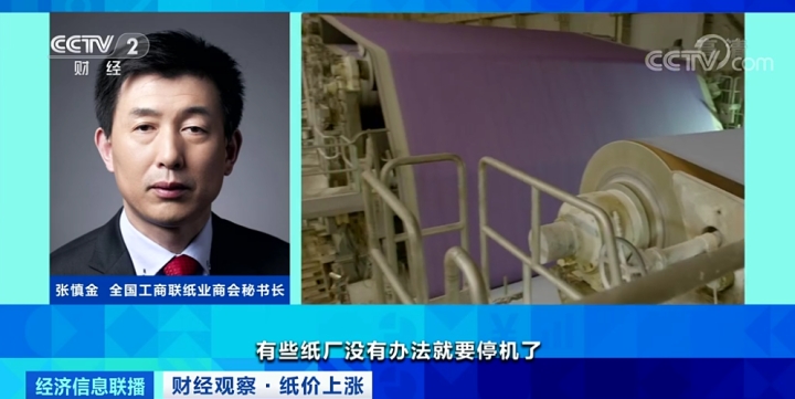 全国工商联纸业商会秘书长张慎金:停机的原因是受纸浆原料价格上涨,造成浆价和纸价的倒挂,这样有些纸厂没有办法就要停机了。