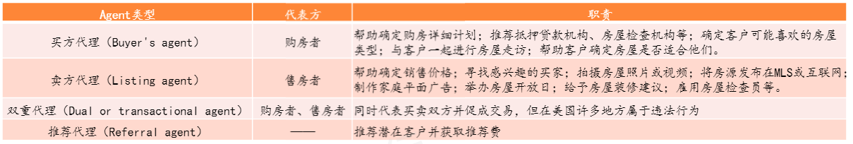 Agent执照要求低,从事经纪服务具体工作,根据服务对象不同可分为Buyer’s Agent、Listing Agent、Dual or Transactional Agent、Referral Agent四类。相比Broker,Agent只须获得房地产许可证,在房地产购买、出售或租赁过程中协助客户并获取交易佣金,但必须在Broker监督下工作。