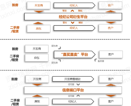 (4) 互联网模式:互联网的快速发展,为房地产市场提供了便捷的交易模式。包括:信息聚合型、交易平台型、中介自营型。