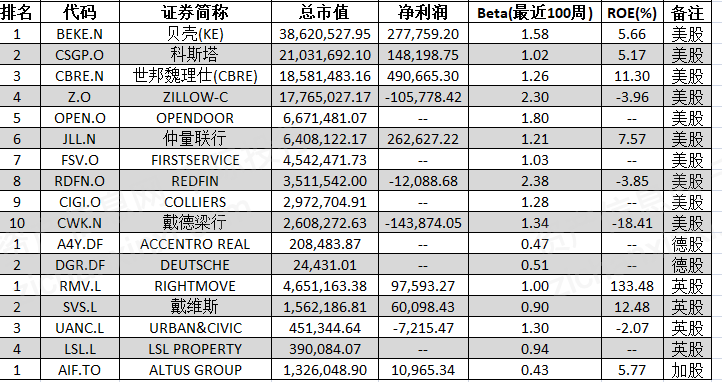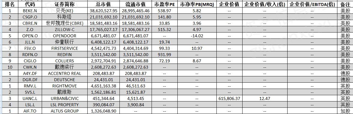 全球非中国主要企业有贝壳(KE)[BEKE.N]、科斯塔[CSGP.O]、世邦魏理仕(CBRE)[CBRE.N]、ZILLOW-C[Z.O]、仲量联行[JLL.N]、OPENDOORTECHNOLOGIES[OPEN.O]、FIRSTSERVICE[FSV.O]、REDFIN[RDFN.O]、高力国际COLLIERSINTERNATIONAL[CIGI.O]、戴德梁行[CWK.N]、DEUTSCHEGRUNDSTUECKSAUKTIONEN[DGR.DF]、RIGHTMOVE[RMV.L]、戴维斯[SVS.L]、URBAN&CIVIC[UANC.L]等。