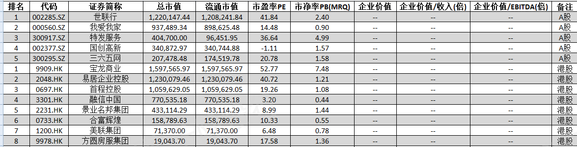 中国主要企业有世联行[002285.SZ]、我爱我家[000560.SZ]、特发服务[300917.SZ]、国创高新[002377.SZ]、三六五网[300295.SZ]、宝龙商业[9909.HK]、易居企业控股[2048.HK]、首程控股[0697.HK]、融信中国[3301.HK]、景业名邦集团[2231.HK]、合富辉煌[0733.HK]、美联集团[1200.HK]、方圆房服集团[9978.HK]等。