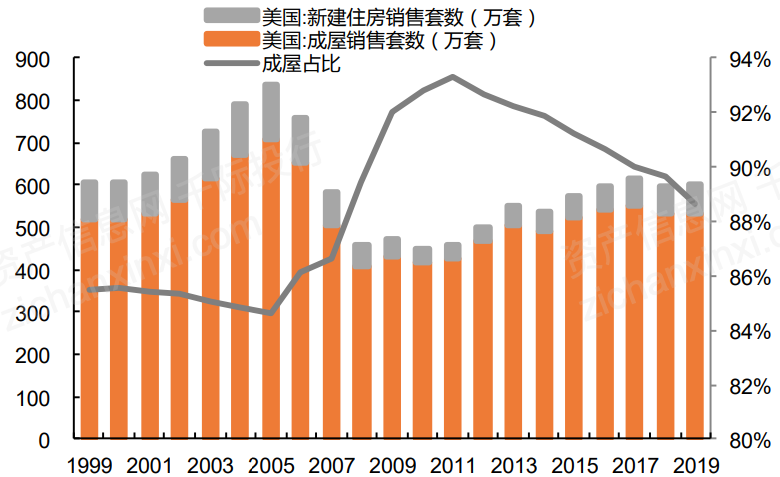 1992-2019年,美国二手成屋销售套数从517万套增至533万套,新房销售套数从88万套降至 68万套,成屋销售占总销售套数比重从85%升至89%,远高于我国(2019年按销售金额口径计算存量房销售占比约33%)。目前美国 二手房流通率约4%,亦高于我国(2.0%)、日本(0.9%)等。